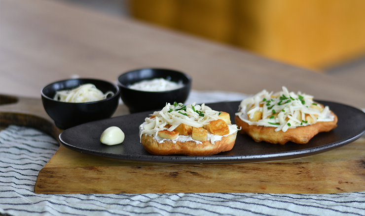 Kenjük meg a lángost tejföllel, dobáljuk rá a Hajdú Grillsajt kockákat, majd szórjuk meg reszelt trappista sajttal is! Aki fokhagymásan szereti, az tehet rá fokhagymát is! 😉